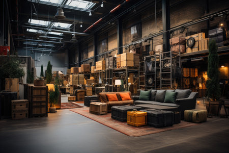 Luminous warehouse full of furniture packed for shipping., generative AI
