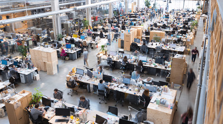 A bustling workspace where teams collaborate creatively showcasing modern office design and teamwork.
