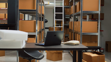 Small business warehouse in storage room filled with carton packs, office space with laptop for product inventory or logistics. Empty depot with stacks of merchandise for stock distribution.