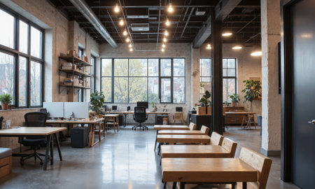 Modern Open-Plan Office With Industrial Decor on a Sunny Day
