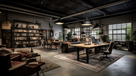 Industrial coworking office interior. 3D rendering,Generative AI.