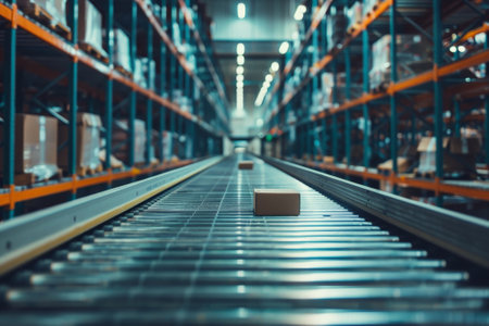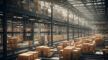 Treadmills move goods in a busy warehouse, generative AI