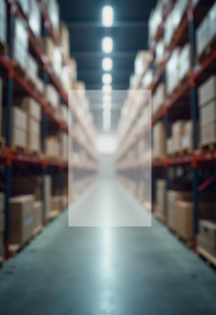 Warehouse interior with a blurred background of shelves stocked with various items, focusing on the vast scale and logistics of industrial storage.