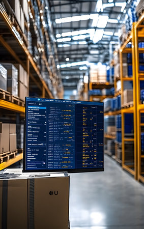 Organized warehouse, stock boxes, office desk with computer displaying charts., generative AI