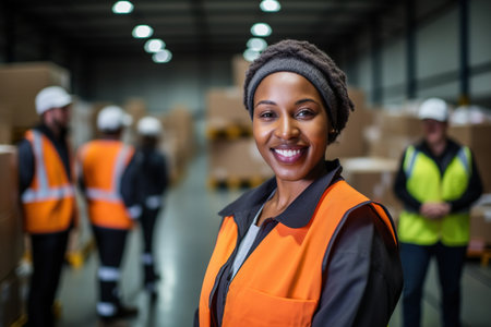 Portrait of smiling female warehouse worker in warehouse with staff in background