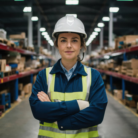 A determined woman wearing a white safety helmet and a reflective vest poses confidently with her arms crossed. She is positioned in the aisle of a large modern warehouse, with rows of shelves filled with products stretching into the background. The industrial environment is illuminated by overhead lighting, highlighting the operational nature of the scene. This image conveys professionalism and competence in a logistics or industrial setting.
