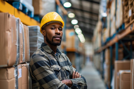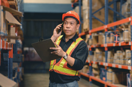 Experience the efficiency of warehouse operations with a middle-aged worker in logistics. Dressed in a uniform, he plays a crucial role in handling goods, managing inventory, and facilitating smooth logistics processes.