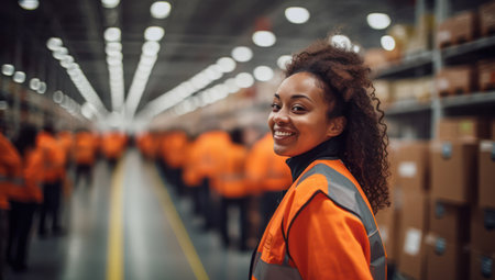 A female warehouse worker wearing an orange safety vest smiles at the camera while standing in an aisle between shelves filled with boxes. The image shows a positive and energetic work atmosphere.