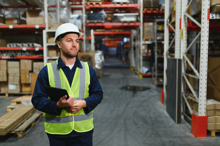 A logistics supervisor in a high visibility vest and hard hat examines warehouse operations. This image captures the diligent oversight in inventory management and workplace safety.