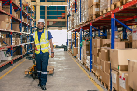 african black warehouse worker using parcel pallet moving cargo for logistics shipping supply management industry