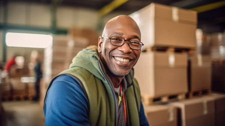 Happy African American warehouse worker.