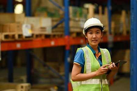 Portrait of an Asian female engineer with the personality of working in the warehouse