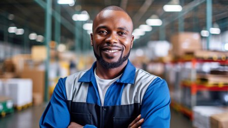 Portrait of happy african american warehouse worker smiling at camera