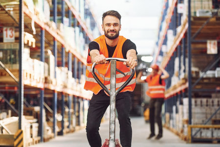 Warehouse worker operates a pallet loader