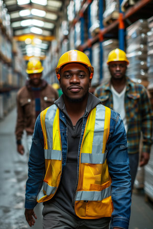 African American male employee in uniform working in a factory warehouse.