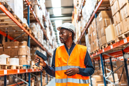 African american warehouse worker use bar code reader scanning packages at storage compartment.