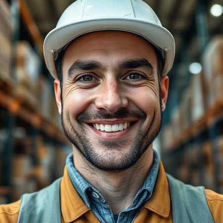 Happy male worker wearing protective hard hat in industrial warehouse looking at camera