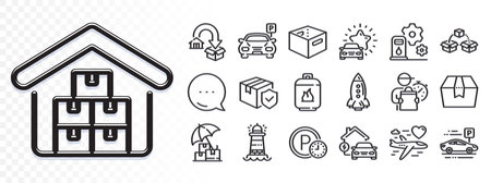 Parking, Delivery insurance and Home charging line icons for web app. Glare of light effect. Message icon. Pack of Gas cylinder, Lighthouse, Parcel shipping pictogram icons. Vector