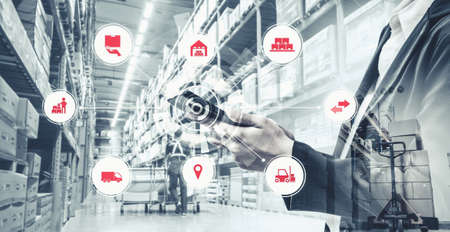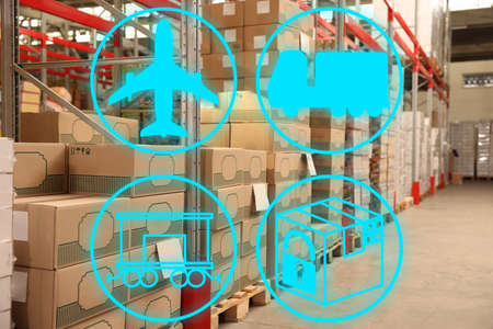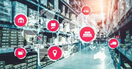 Logistics network Wholesale and Retail. Icon of marketing and process channels transport and logistic on warehouse background.