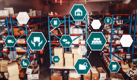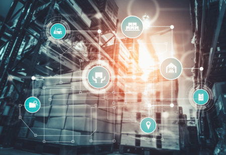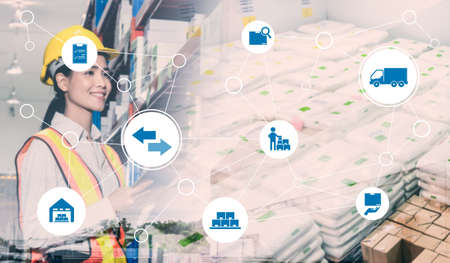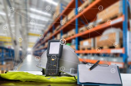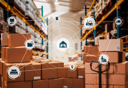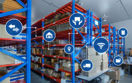 Smart warehouse management system with innovative internet of things technology to identify package picking and delivery . Future concept of supply chain and logistic network business .