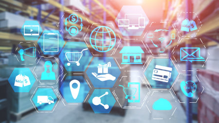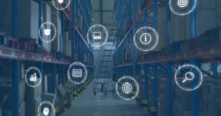 Showing warehouse aisle with racks holding boxes pallets with wheeled ladder and digital icons. Logistics, inventory, automation, efficiency, storage, supply chain, technology