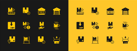 Set Warehouse interior with boxes Delivery hand Carton cardboard Tax Free storage Conveyor belt and icon. Vector.