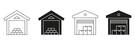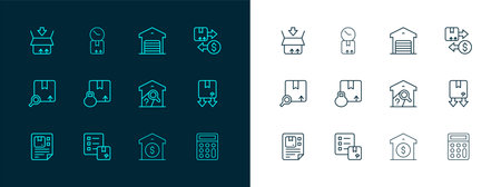 Warehouse Storage Line And Solid Icon Set. Logistics, Inventory Management, And Goods Storage Silhouette Symbol Collection. Distribution And Supply Chain. Isolated Vector Illustration