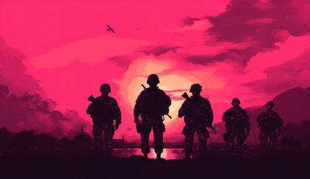 A group of soldiers stand in formation, holding flags and wearing uniforms. The scene is set at sunset, creating a serene and peaceful atmosphere. The soldiers are positioned in a line