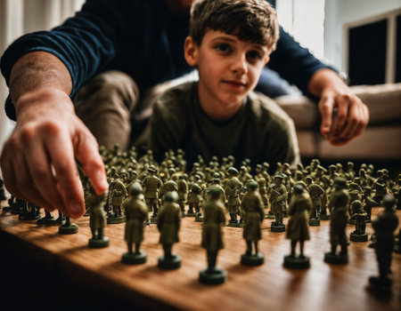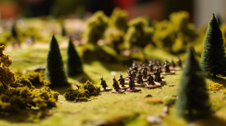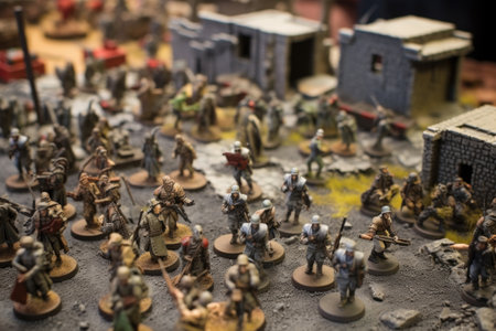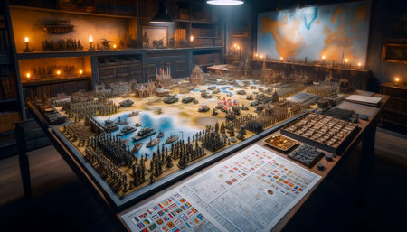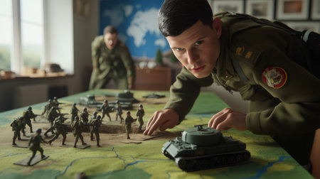 Military historian and enthusiast recreating a famous battle on a large diorama with toy soldiers and tanks