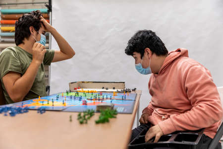 Group of youths with face masks during COVID-19 disease quarantine playing a board game.