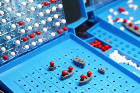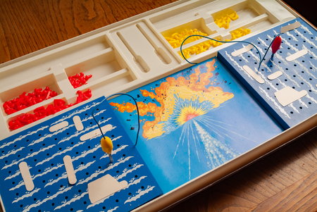 1980s battlefield table game with paper ships and electonic accessories for playing and fightning.kitchen wood table inside a private apartment. Italy Europe