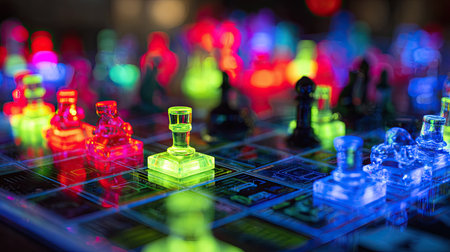This image showcases a chessboard with translucent pieces illuminated by vibrant neon lights. The composition highlights the geometric grid and diverse colors, creating a visually striking effect. The dynamic lighting suggests a game in progress, ideal for use in editorial content or commercial projects related to strategy or design.