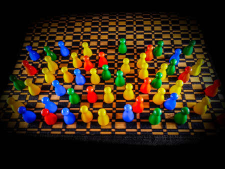 Stacked meeples prepared for a game of board game. Army of meeples colored wooden figures with human shape. To play.