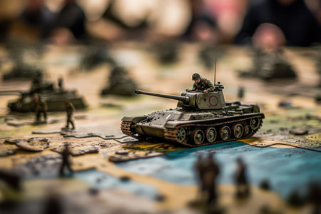 A model tank is strategically positioned on a complex battlefield map with tiny soldiers surrounding it.