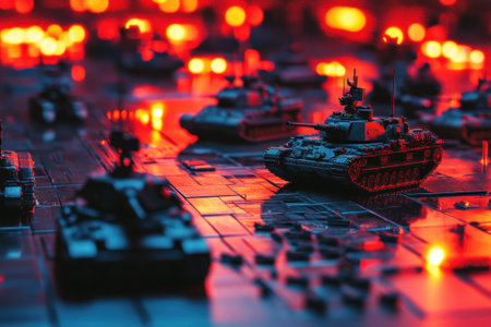 A collection of model tanks arranged on a heated battlefield, illuminated by vibrant red lights.