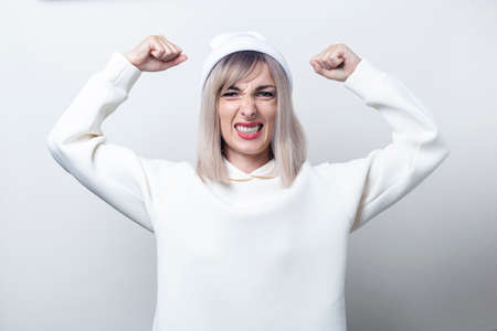emotion. angry mad cross woman clenching fists. fury and grimace of rage concept. face like thunder. young beautiful brunette girl portrait