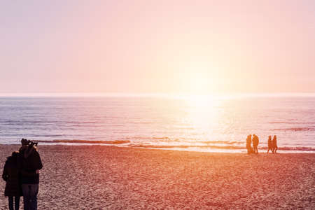 Colorful sunset at a famous marine pier in resort city of Palanga, Lithuania, Europe.people walk on the beach