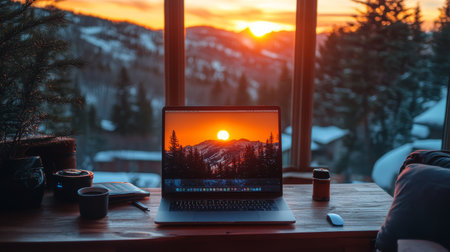 Capture the essence of remote work with a laptop against a stunning sunset view. This image showcases a cozy workspace immersed in nature, perfect for productivity and inspiration.