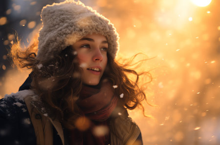 Portrait of a beautiful young woman in winter forest at sunset.