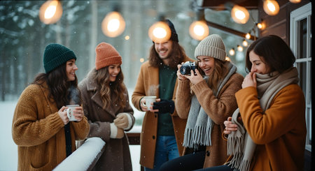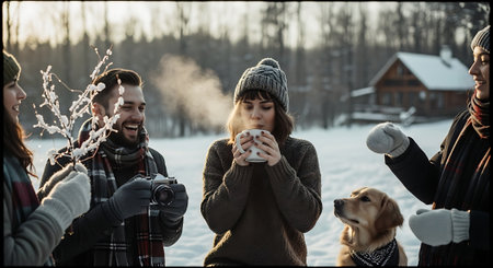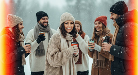A group of friends enjoying hot beverages in a snowy landscape, dressed in winter clothing, smiling and laughing together