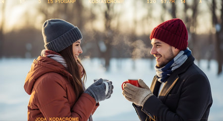 Couple in love holding a cup of hot coffee in the winter forest