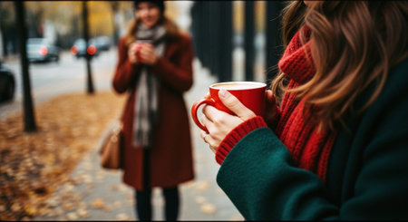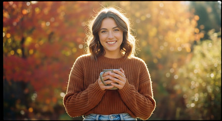 A young woman enjoying a cup of coffee on a crisp autumn day outdoors