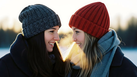 Two young women in winter clothing looking at each other and smiling.