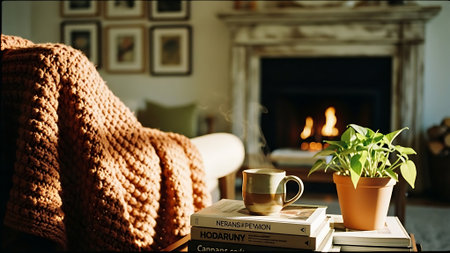 Cozy living room with book, coffee cup and potted plant