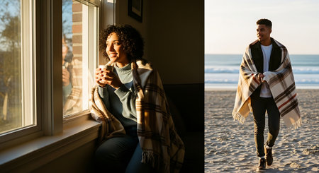 collage of mixed race woman and man wrapped in plaid standing on beach
