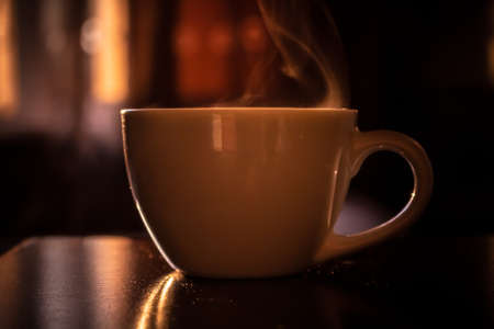 Cup of hot coffee on a wooden table in the sunlight.