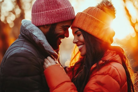 In a serene outdoor setting during the golden hour a man tenderly assists his wife in putting on a warm jacket.