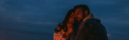 panoramic shot of bearded man touching attractive woman at night