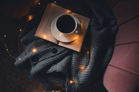 Cup of coffee stay on open paper bok with knitted sweater on sofa close up. Working home at night.