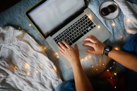 Woman working with laptop on bed with glass of champagne, top view. natural linen bedspread